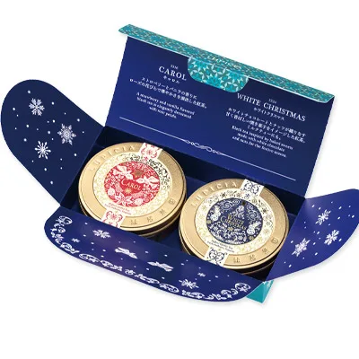 An assortment of two different Christmas teas in convenient tea bags, all packed into cute, tiny tins.